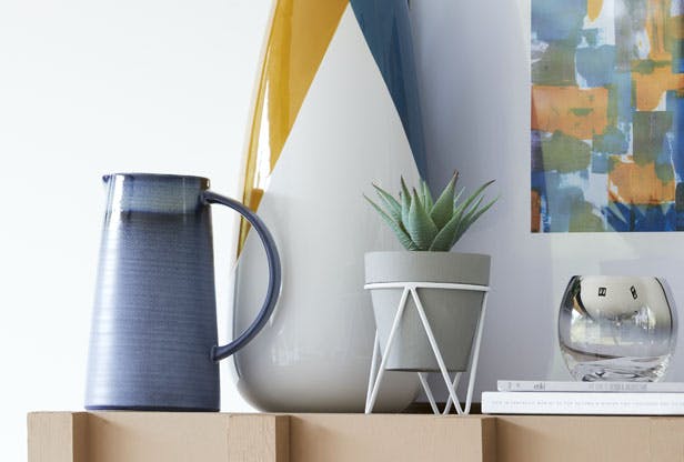From smaller functional pieces to home decor, colour can easily be added to any room through accessories. Try swapping your plain white towels to colourful or patterned alternatives, add a lamp with a lot of character, or update bookshelves and windowsills with interesting vases with lustrous finishes and reactive glazes.