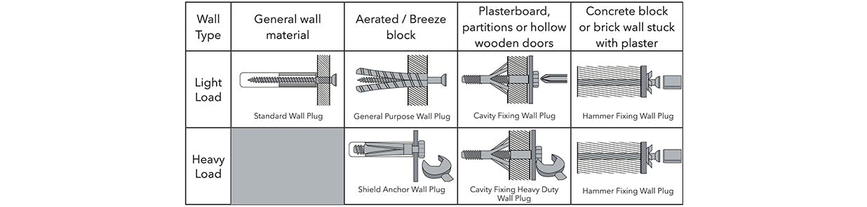 4. Hold the wall plug up to the drill bit, and use a piece of tape to mark the length of the plug on the bit. You’ll need to drill slightly deeper than the length of the plug. Check the visual guide below for some help in choosing the right plug for your wall type.
