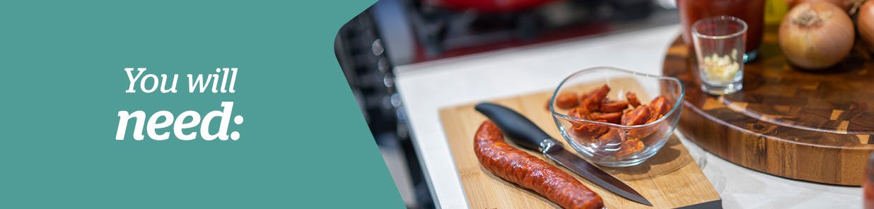 2. Once the onion is soft, add the diced chorizo and garlic and cook for a further 5 minutes.